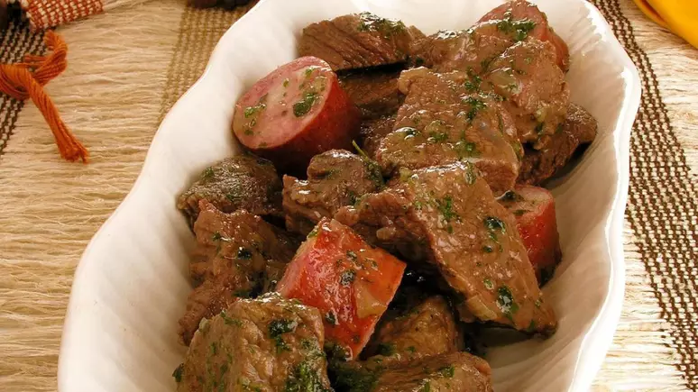 Adicione a cebola e o alho picados, deixe dourar, acrescente a tomate e a azeitona picadas, a páprica, o orégano e refogue bem,
